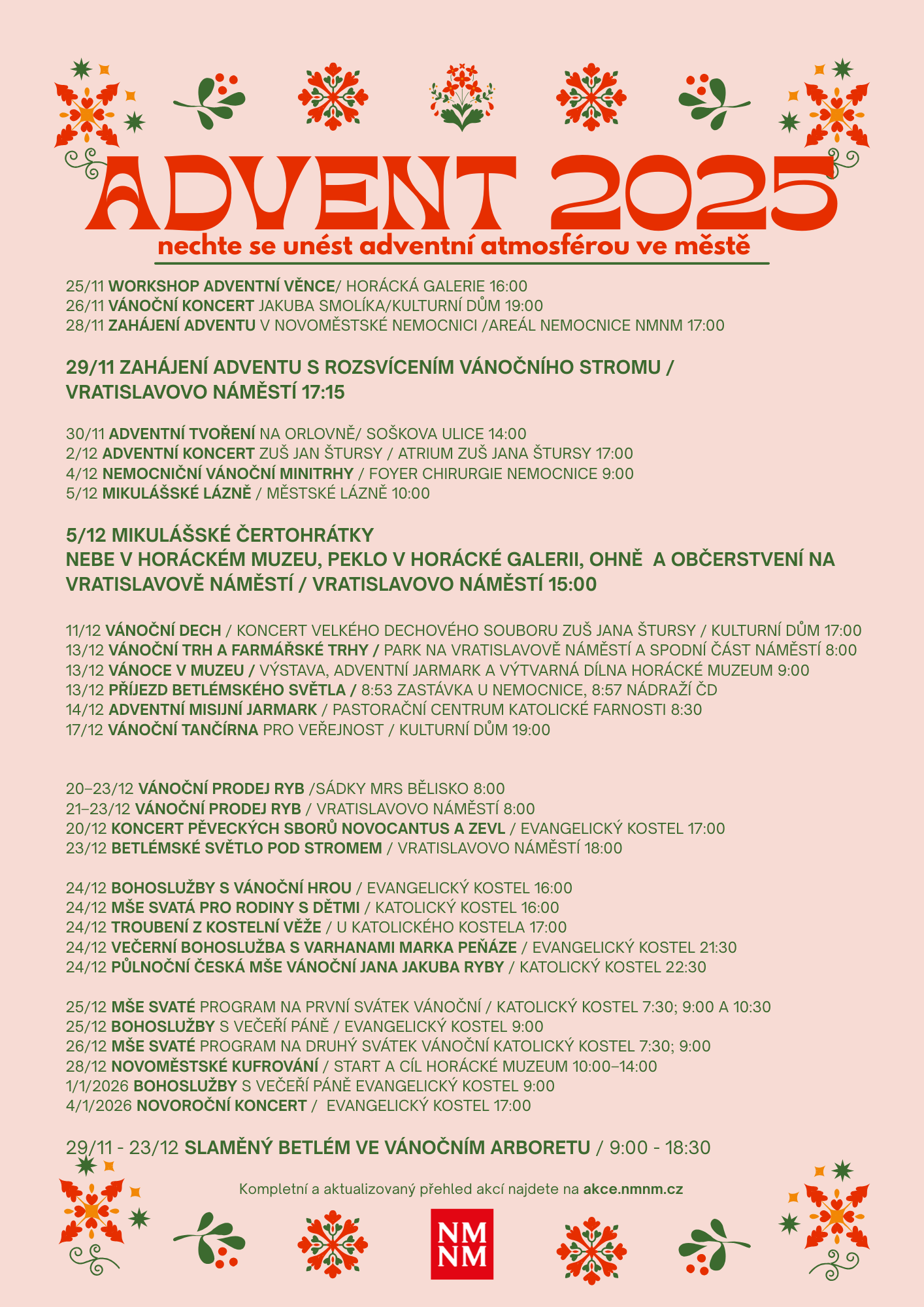 Nové Město vstupuje do nejkrásnějšího období v roce. O vánoční výzdobu se i tentokrát postarali pracovníci Technických služeb. A to hlavní přijde v sobotu 29. listopadu, kdy bude na Vratislavově náměstí rozsvícen vánoční strom. Sraz je v 17:15. Vystoupí žáci ZUŠ Jana Štursy, sváteční slovo pronesou evangelický farář Ondřej Ruml, římskokatolický kněz Miroslav Kulifaj a starosta Michal Šmarda. Chybět nebudou stánky s občerstvením, zvonička štěstí ani představení nového betlému, který navrhl grafik a ilustrátor Lukáš Tomek ve spolupráci se ZUŠ. Podstavec vytvořil kovář Pavel Klimeš a kortenové panely vyřezala firma WAPA, spol. s r.o. „Betlém je náš, Novoměšťáků, takže bych rád, aby se rozrůstal a postupně se postavy objevovaly v různých částech města. Děkuji všem, kteří přidali ruku k dílu,“ říká novoměstský starosta Michal Šmarda. Slaměný betlém bude nově umístěn v arboretu, kde bude možné svátečně rozjímat. Novinkou pro letošní rok bude i nasvícený strom na Starém sídlišti. První adventní neděle 30. listopadu nabídne od 14:00 dobročinný jarmark u evangelického kostela, jehož součástí bude i sbírka Krabice od bot. Současně proběhne také adventní tvoření na Orlovně. V úterý 2. prosince zazní v našem městě adventní koncert, který se odehraje v atriu ZUŠ v 17:00. Další vánoční koncert dechového orchestru a souboru bicích nástrojů ZUŠ se uskuteční ve čtvrtek 11. prosince od 17:00 v kulturním domě. Novoměstská nemocnice zve 4. prosince na Nemocniční minitrhy. Pátek 5. prosince patří tradičním Mikulášským čertohrátkám s peklem v Horácké galerii, anděly a Mikulášem v Horáckém muzeu, kde se bude také tvořit s DDM. Na náměstí si bude možné opéct buřty a zahřát se svařákem. Dárkem pro všechny bude koncert Anety Langerové, který se uskuteční v úterý 9. prosince od 19:00 v kulturním domě. V sobotu 13. prosince uděláme tečku za letošním, celkově již 15. ročníkem novoměstských farmářských trhů. V parku na Vratislavově náměstí proběhne závěrečný trh a současně s ním se uskuteční vánoční trh. Ve stejný den nabídne Horácké muzeum program Vánoce v muzeu s výstavou historických hraček, dílnami a adventním jarmarkem. Ve stejný den dorazí do města Betlémské světlo, pro které si lze přijít na zastávku u nemocnice v 8:53 nebo na nádraží ČD v 8:57. Novoměstští skauti budou Betlémské světlo rozdávat den před Štědrým dnem. Vyzvednout si ho můžete pod vánočním stromem od 18:00 do 19:00. V neděli 14. prosince se na farním dvoře uskuteční Adventní misijní jarmark. Od soboty 20. prosince se na sádkách rozběhne prodej ryb, stánek s kapry bude následně od 21. do 23. prosince otevřen i na Vratislavově náměstí. Štědrý den tradičně patří bohoslužbám. Mše svatá pro rodiny s dětmi se uskuteční v kostele sv. Kunhuty od 16:00. Troubení koled z věže kostela si budete moci poslechnout po jejím skončení od 17:00. Půlnoční mše svatá J. J. Ryby zazní v katolickém kostele od 22:30. V kostele sv. Kunhuty proběhne tradiční prohlídka betléma, a to v termínech 26., 31. prosince a 1. ledna vždy od 14:00 do 16:00. Evangelický sbor zve 24. prosince na vánoční divadlo dětí od 16:00 a štědrovečerní bohoslužbu s varhanami Marka Peňáze v 21:30. Na Boží hod budou bohoslužby sloužit obě farnosti. V neděli 4. ledna můžete vyrazit na Novoroční koncert. Uskuteční se od 17:00 v evangelickém kostele. Mezitím ještě stihnete letošní ročník Novoměstského kufrování, který je naplánován na neděli 28. prosince. Startuje se od 10:00 od Horáckého muzea. Kompletní přehled plánovaných akcí najdete v dokumentu připojeném pod článkem.
